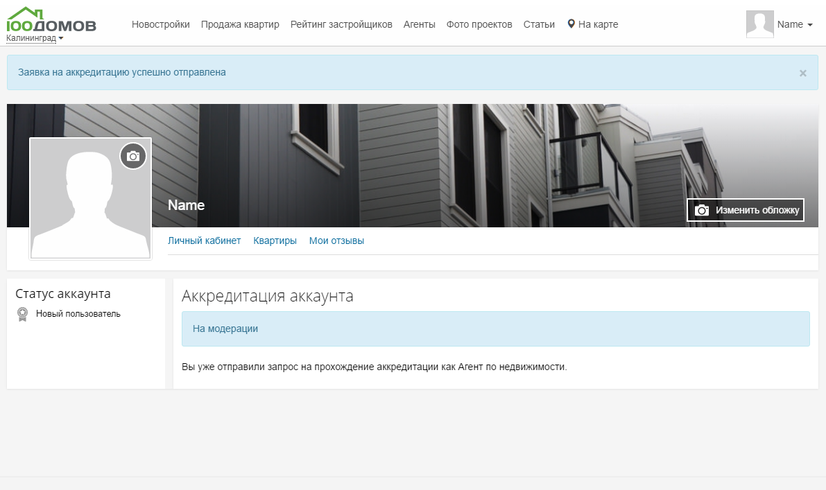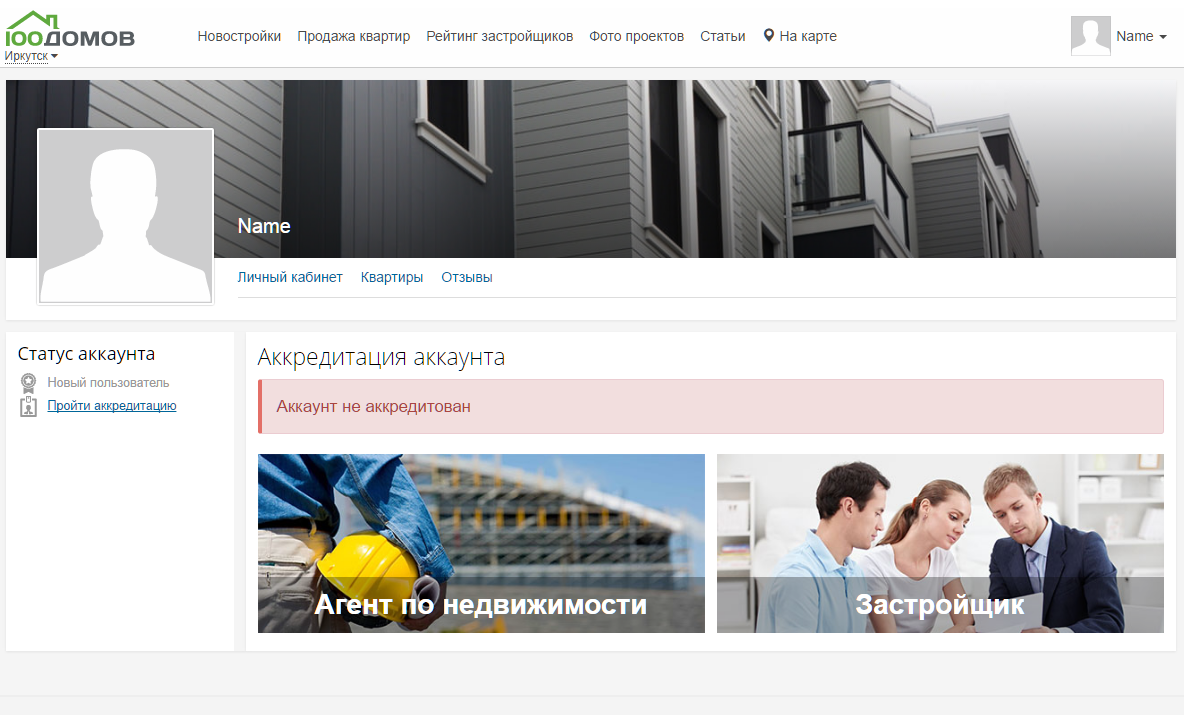 После регистрации будет доступен интерфейс обычного посетителя портала с возможностью подачи объявления о продаже квартиры как от собственника и написанию отзыва о застройщике или об агенте.